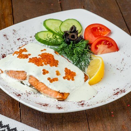 Филе судака с запечеными овощами (перец, баклажан, шампиньоны)