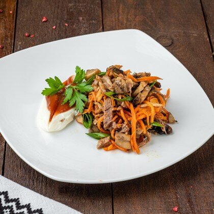 Курочка, язычок, ветчинка, шампиньончики, заправлен майонезом и горчичкой